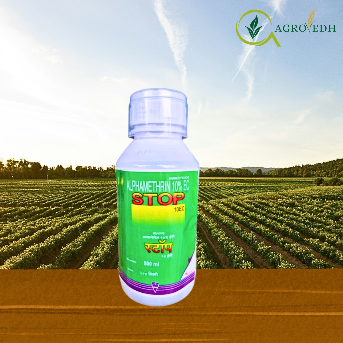 Biostadt Stop Insecticide (Alphamethrin 10% EC) is a powerful synthetic pyrethroid insecticide formulated for rapid knockdown and long residual control of major crop pests. Powered by Alphamethrin 10% EC, it delivers strong contact and stomach action, ensuring quick paralysis and death of insects. Known for its fast action and broad-spectrum control, it is widely used in cotton, vegetables, pulses, and fruit crops for managing bollworms, aphids, jassids, thrips, and caterpillars.