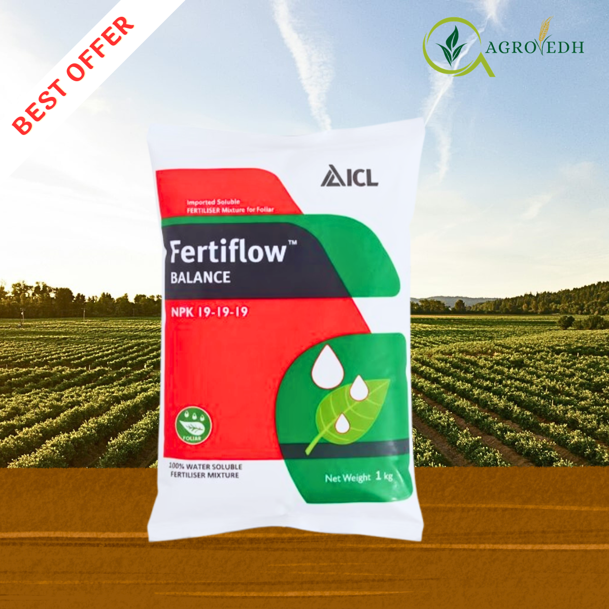 ICL Fertiflow Balance 19:19:19 is a premium fully water-soluble NPK fertilizer developed by ICL Group, designed to provide balanced plant nutrition during vegetative growth and early crop development stages. It contains Nitrogen (19%), Phosphorus (19%), and Potassium (19%), ensuring crops receive equal proportions of essential nutrients required for strong root formation, healthy foliage, and improved flowering.